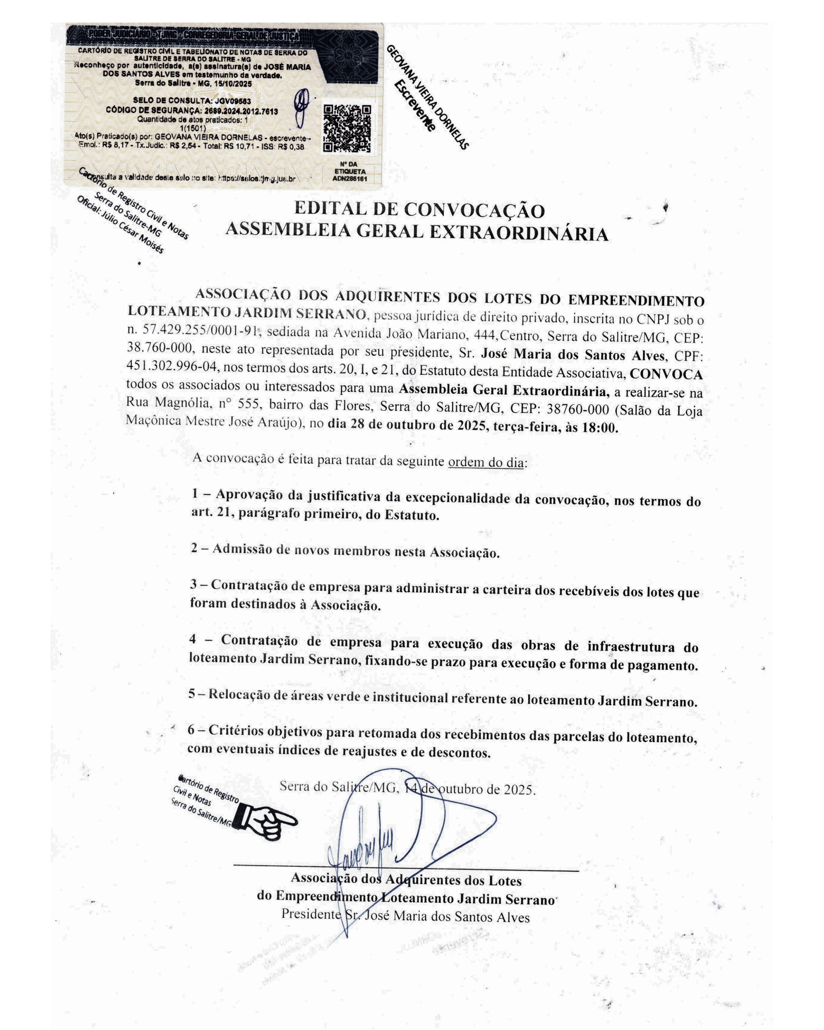 Nesta sexta-feira 17, foi publicado o Edital de Convocação Assembleia Geral Extraordinária: ASSOCIAÇÃO DOS ADQUIRENTES DOS LOTES DO EMPREENDIMENTO LOTEAMENTO JARDIM SERRANO.